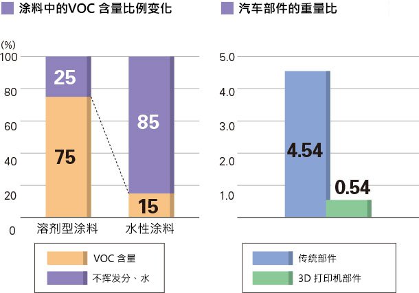 过去汽车涂装等用途所使用的金属颜料只适用于含有大量 VOC*的溶剂型涂料。而采用东洋铝业株式会社表面处理技术后还可适用于各种水性涂料,从而能够将涂料中的 VOC 含量减少大约 80%※1。